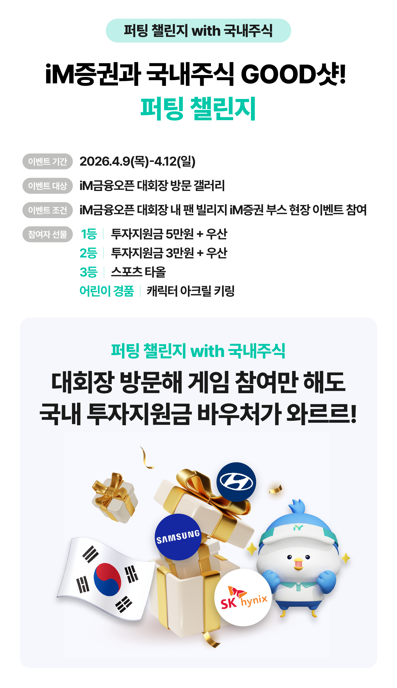 현장이벤트는 2026.04.09(목)~2026.04.12(일) 기간 동안 진행되며, iM금융오픈 대회장 내 빌리지 iM증권 현장이벤트에서 참여 가능합니다.